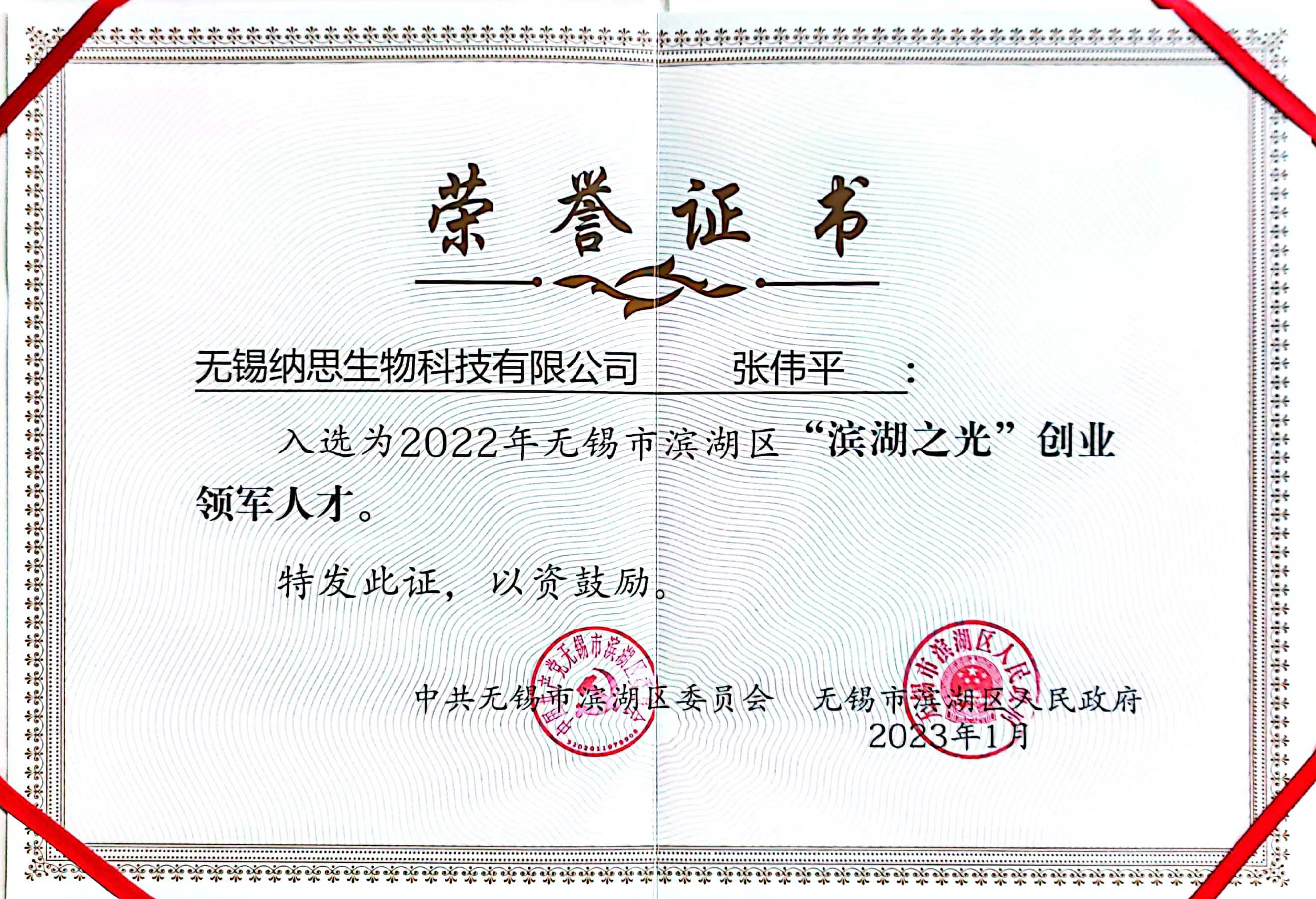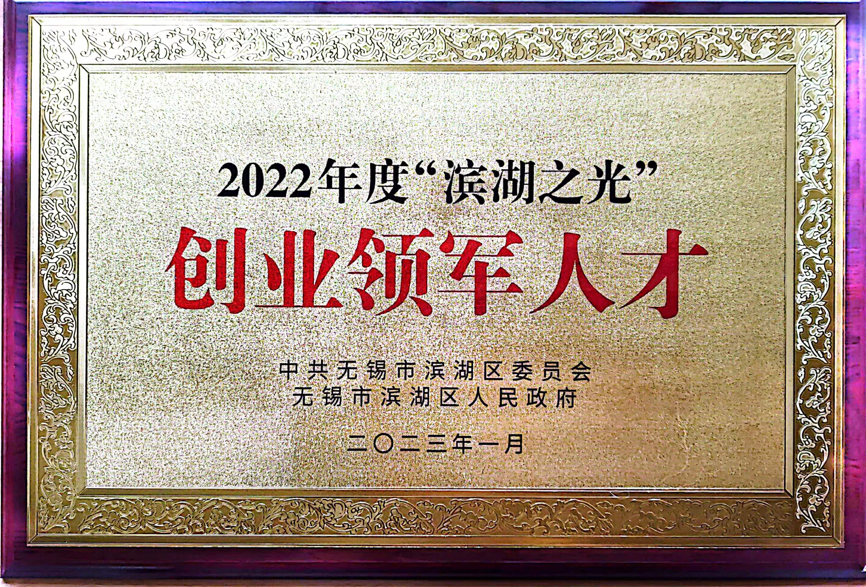 獲得無(wú)錫市濱湖區(qū)"濱湖之光·創(chuàng)業(yè)領(lǐng)軍人才“稱(chēng)號(hào)